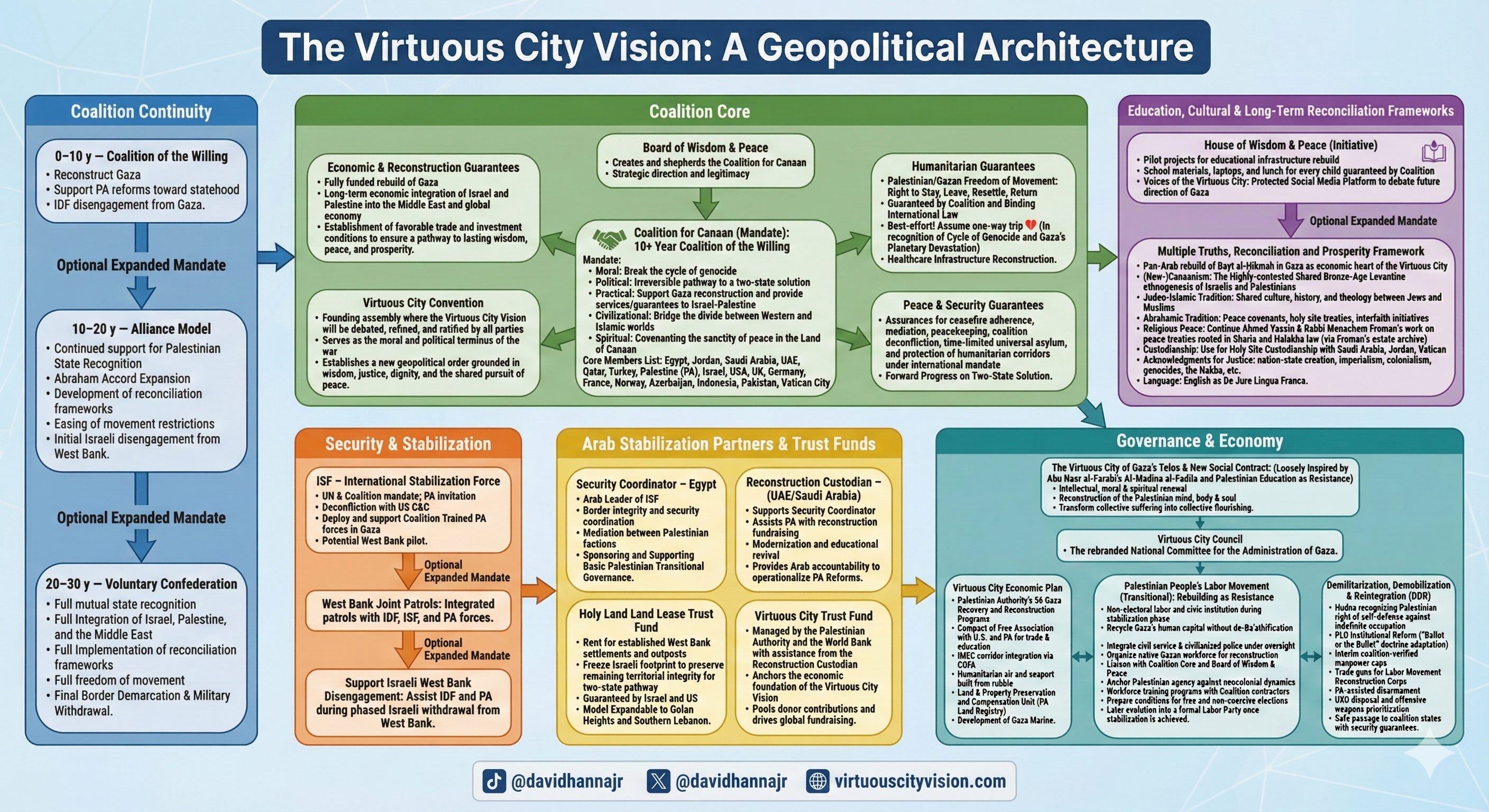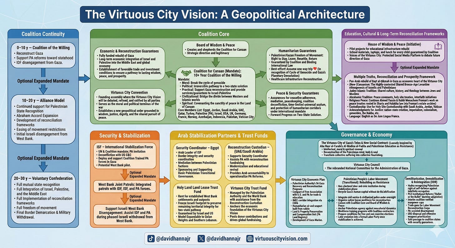 The Coalition functions within the broader Virtuous City Vision, which serves as the civilizational, geopolitical, and security architecture for the Middle East. Within this framework, Gaza operates as a primary pilot zone, while the Coalition for Canaan serves as the Israeli–Palestinian execution layer—integrating hard security arrangements, political stabilization, reconstruction discipline, and long-horizon civilizational repair into a single operational system.